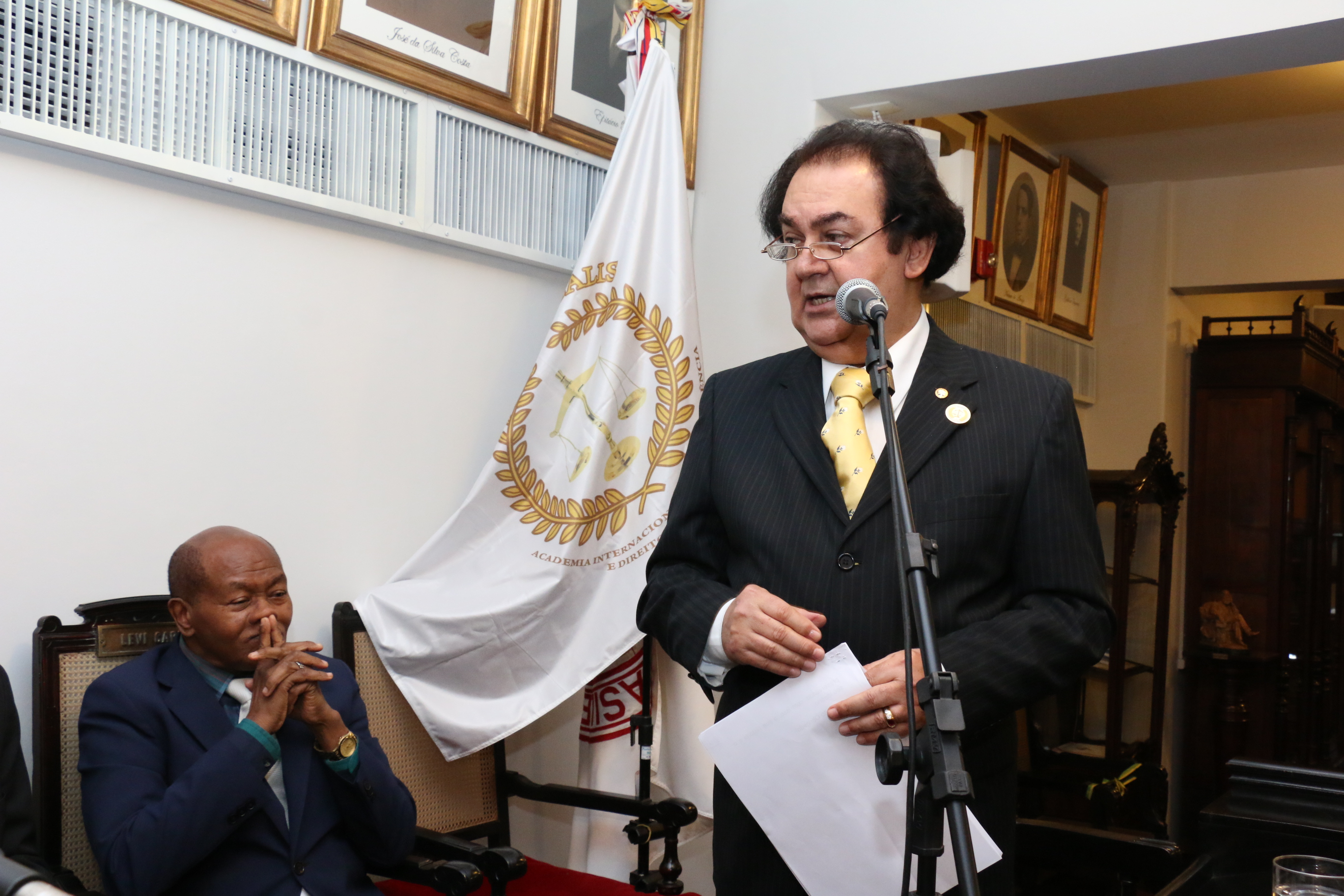 É com grande alegria e elevada satisfação, que ocupamos esta Tribuna, da tradicional e enriquecedora Casa de Montezuma, por onde passaram personalidades, da mais alta expressão do mundo jurídico brasileiro, dando-lhe dimensão e grandeza, para, nesta feliz oportunidade, ser agraciado com a aprovação do nosso nome para integrar os quadros da histórica Academia Internacional de Jurisprudência e Direito Comparado, cuja posse se dá nesta noite festiva.